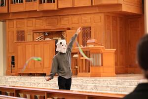 その後、小休憩を挟んで開始した第二部では、最初にアカペラサークルreMix(リミックス)の6名がマイク一つでの演奏を披露。気持ちのこもった歌声は、聴いていた方々の心に届いていた様子でした。続いての奇術研究会からは「ハト人間」が登場し、「ポイ」というジャグリングと、続いて別部員が「リンキングリング」というマジックを行ないました(※)