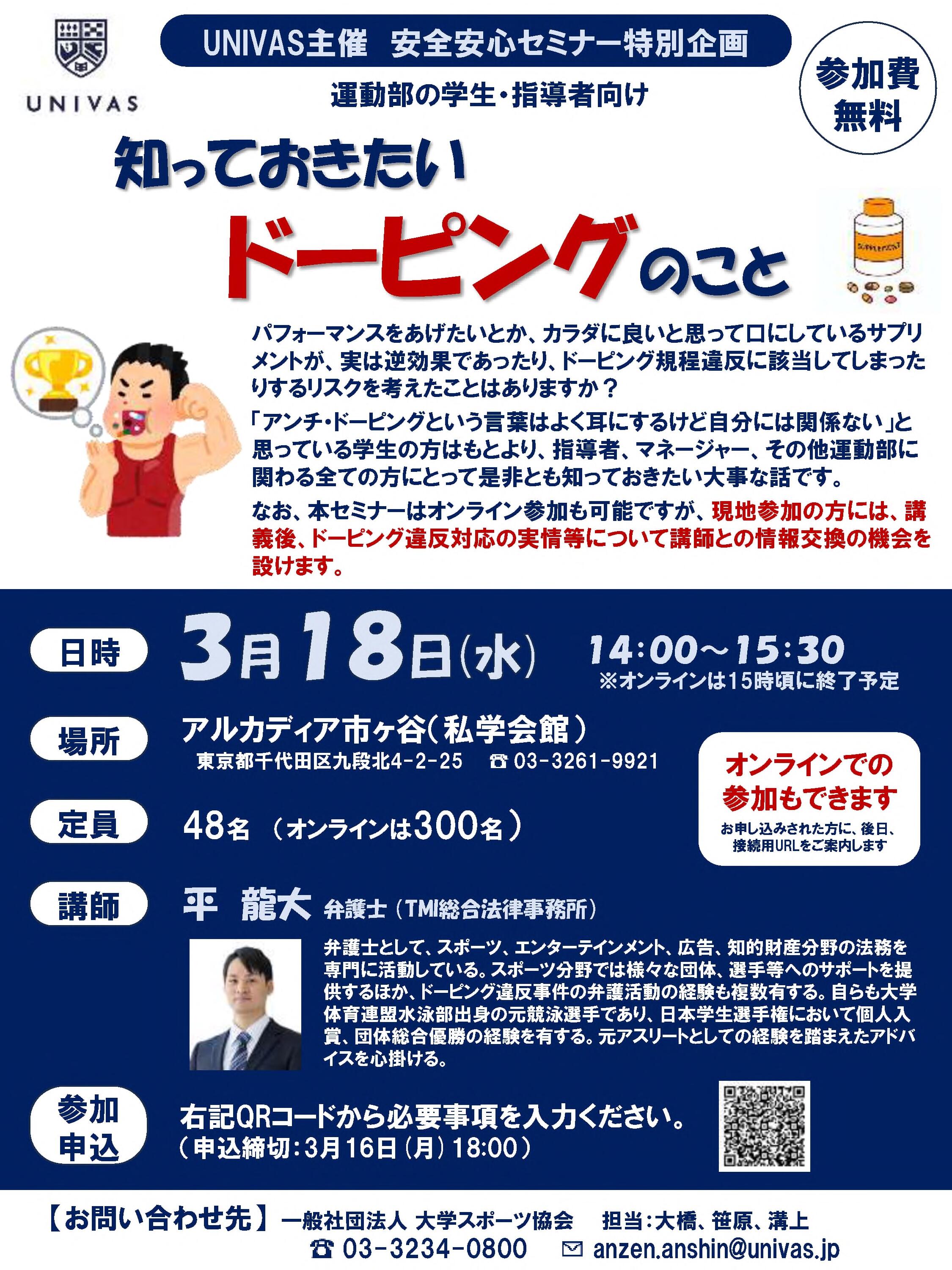 大学スポーツ協会安全安心セミナー特別講演「知っておきたいドーピングのこと」開催のご案内