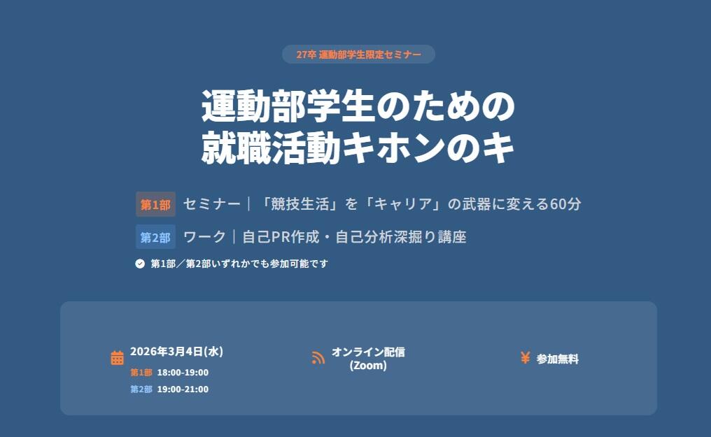 ◾️日時:2026年3月4日(水)18:00-21:00予定 ◾️対象者:2027年3月卒業予定者、UNIVASの加盟大学職員、競技団体スタッフ ◾️内容: 3月から本格スタートする就職活動に向けて就職活動のポイントや運動部出身の先輩による体験談などをお伝えするオンラインセミナーです。 第1部 18:00-19:00 セミナー|「競技生活」を「キャリア」の武器に変える60分 第2部 19:00-21:00 ワーク|自己PR作成・自己分析深掘り講座 ▶詳細はこちら→ https://univas.jp/dualcareer/article/202602191698706/ ▶申込はこちら→ https://forms.gle/KTZz8hw8yV1xC4jd7 ――――――――――――――――――――――――――――――――― UNIVASでは、運動部学生のデュアルキャリア支援の取り組みとして、 今後も様々な取り組みを行ってまいります。何卒よろしくお願いいたします。 【本件に関するお問合せ先】 一般社団法人大学スポーツ協会 E-mail: dual_career@univas.jp //////////////////