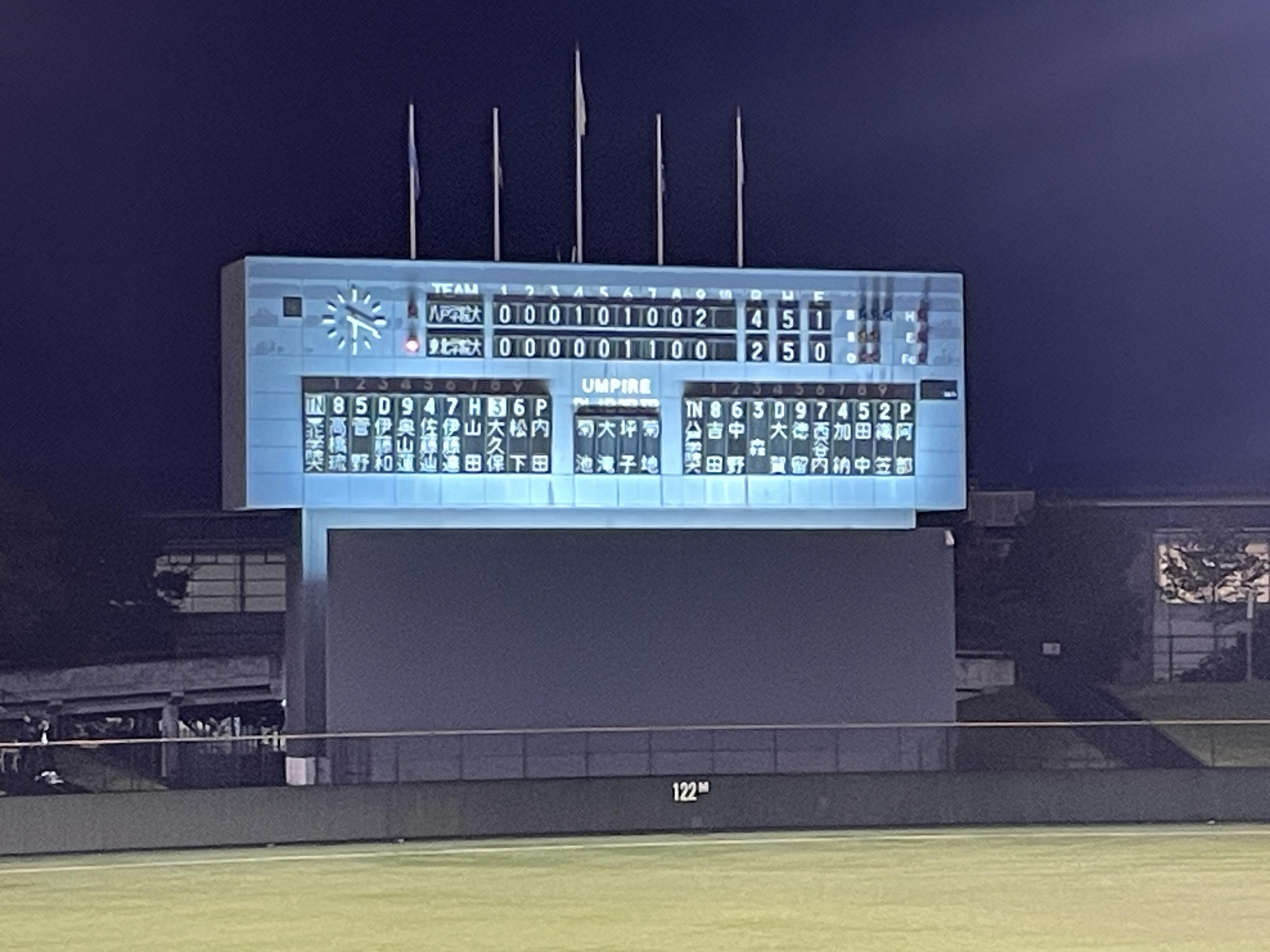 勢いに乗って臨んだ第3試合。相手は同じく八戸学院大学でしたが、スタメン野手7人を交代するという大胆な戦術転換を行い、第1試合とは全く異なる堅守を見せました。両チームとも一歩も譲らない緊迫した試合展開が続きましたが、9回表に勝ち越し弾を許してしまい、最終的に2-4で敗戦。惜しくも明治神宮野球場への切符は逃す結果となりました。