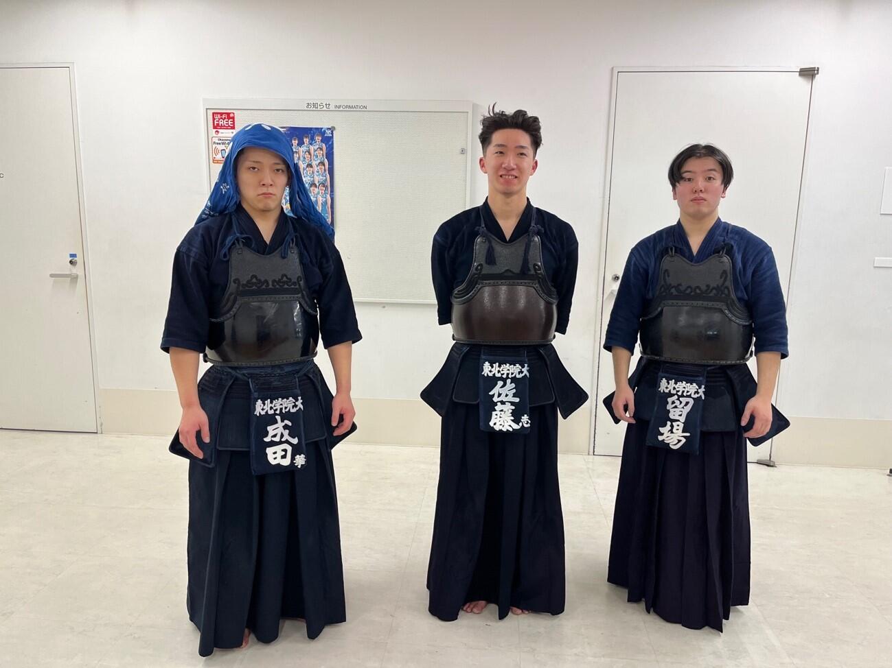 本学からは、男子参段以上の部団体戦に佐藤志暢(法学部3年)、留場大翔(法学部3年)、成田華琉(経済学部3年)の3名の選手が出場しました。